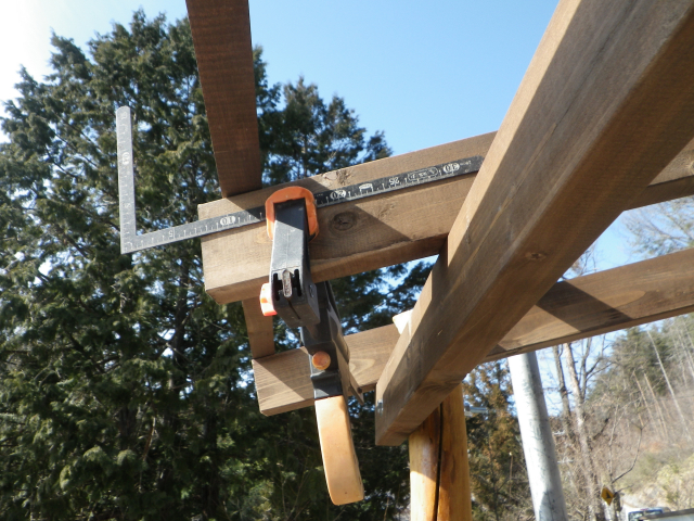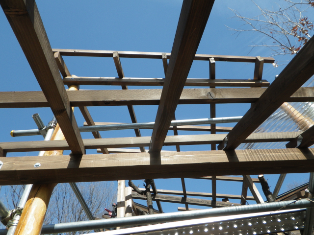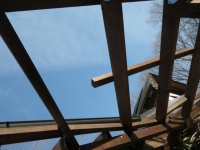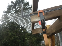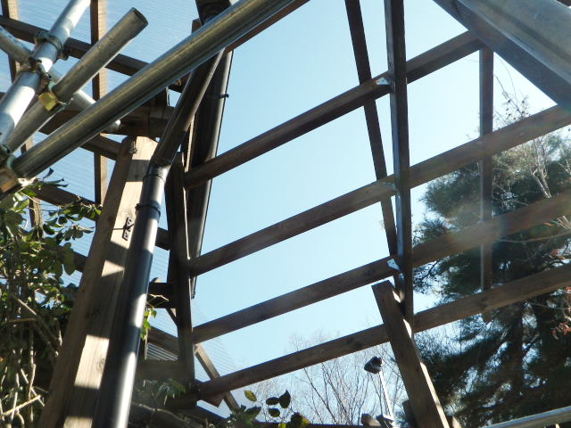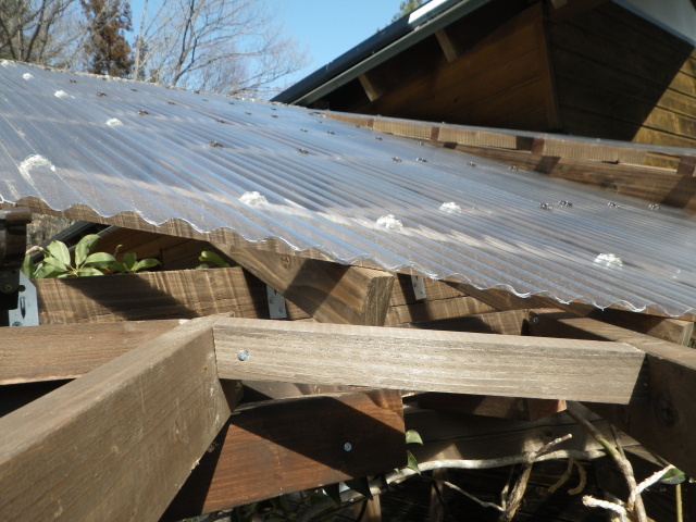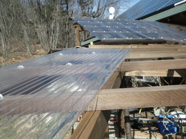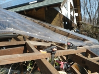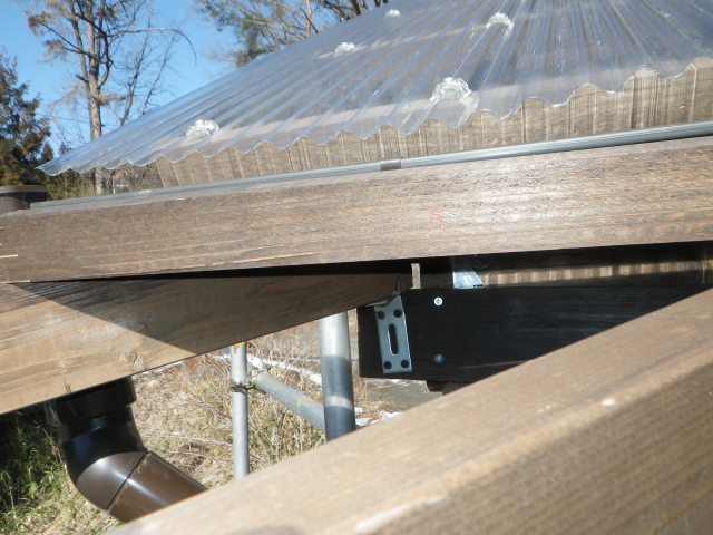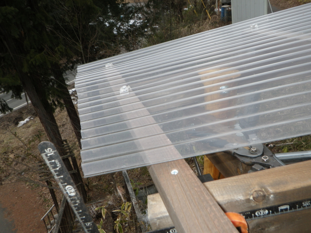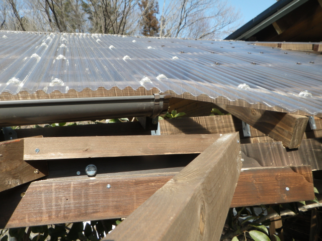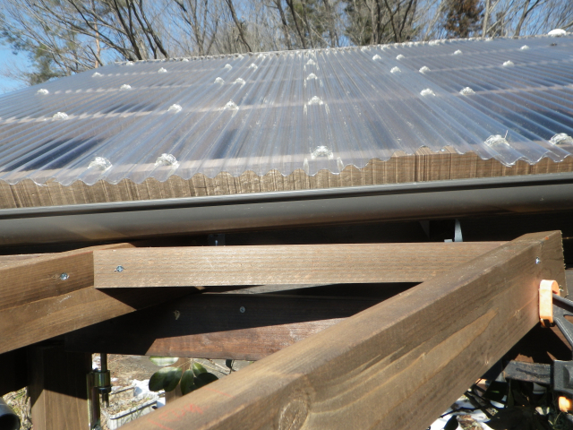 桃を囲う部屋の屋根の桟の取付〜ポリカ波板張り