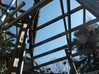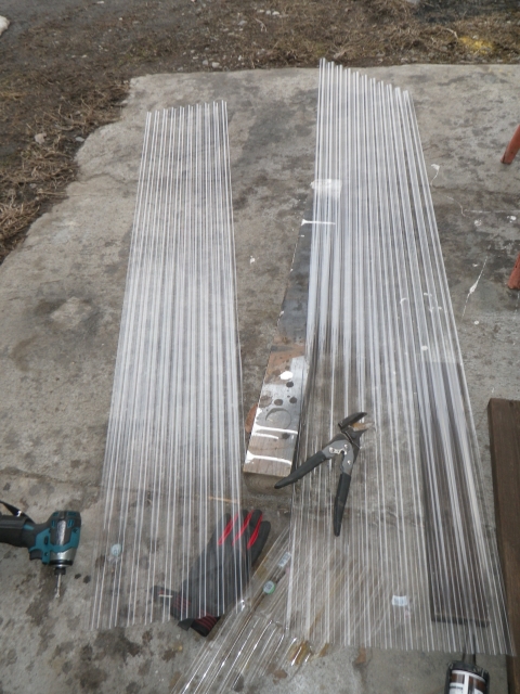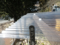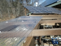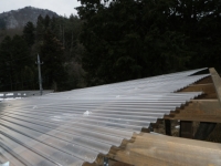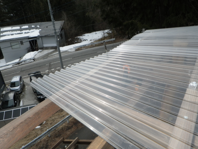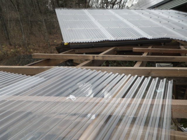 桃を囲う部屋の屋根の桟の取付完了して、西端からポリカ波板張り