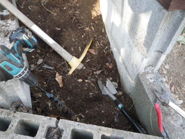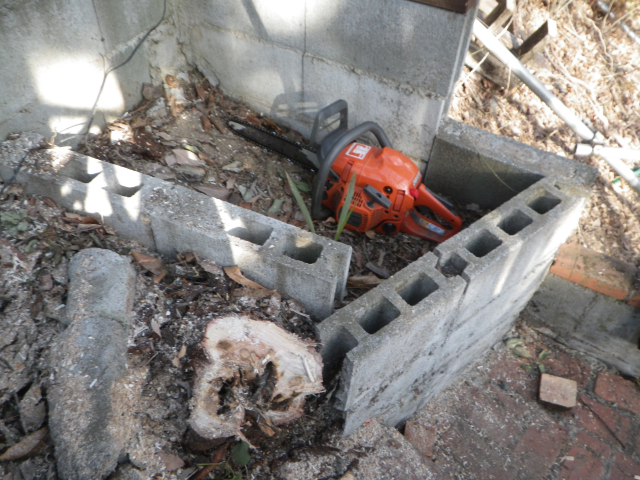 前回の伐採で残ってる根をもう少し小さくして、その隣を新たに花壇にするため開墾とか
