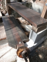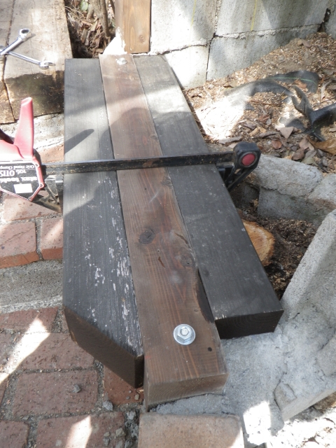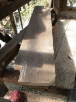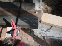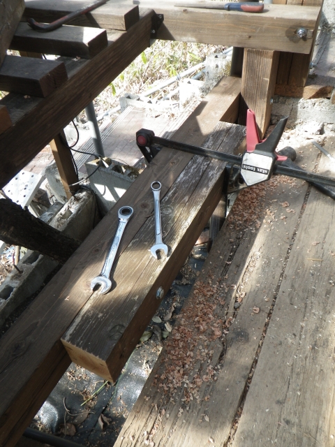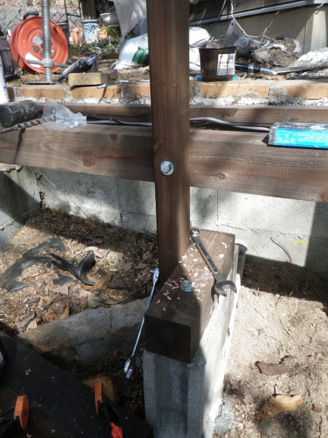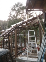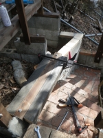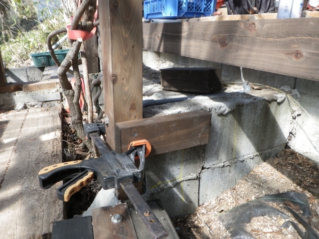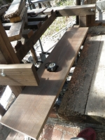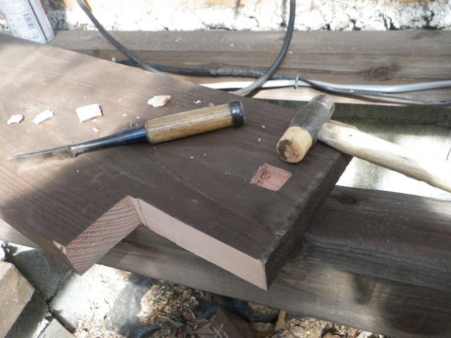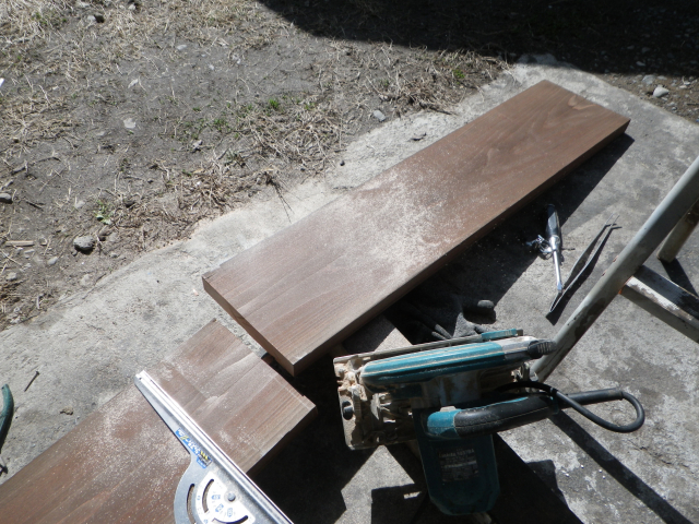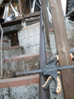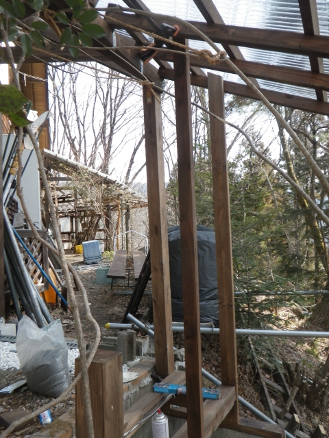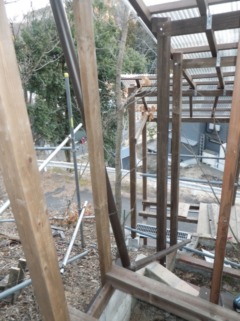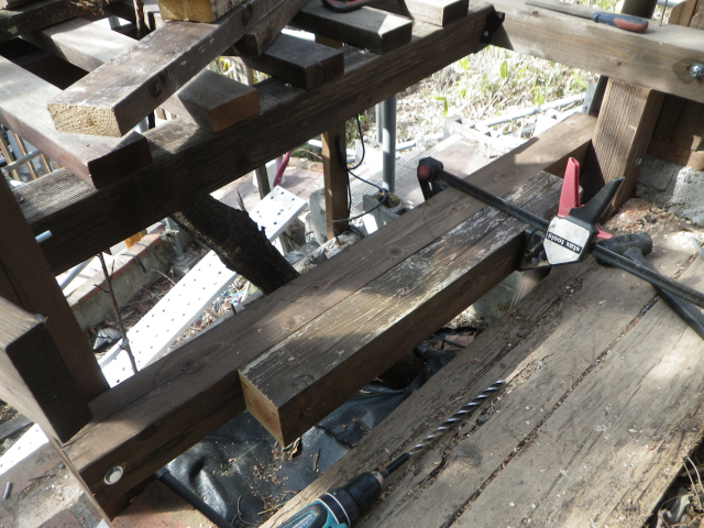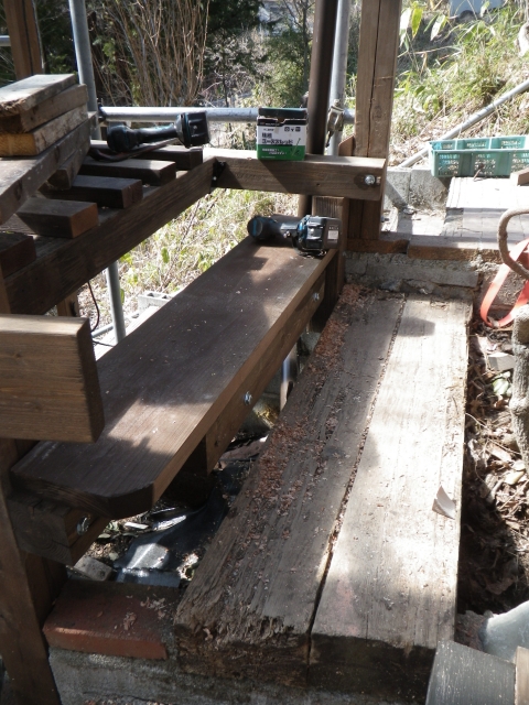 | 桃を囲う部屋の階段のデッキ張り、ここも階段板は足場板材 |