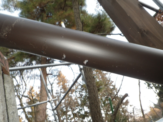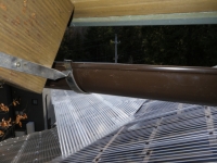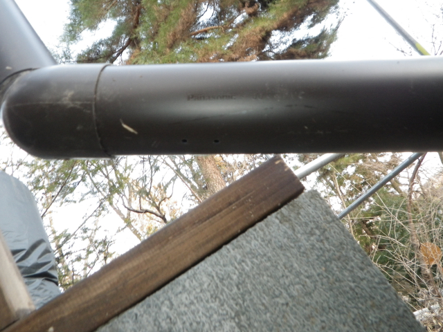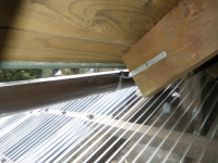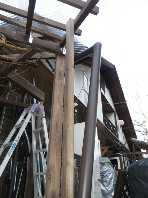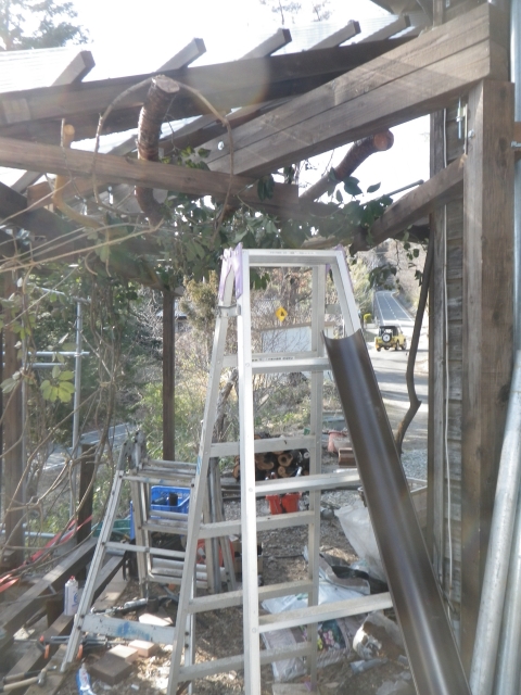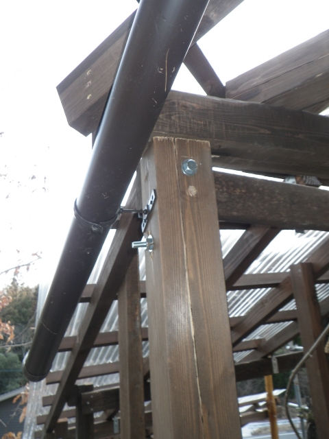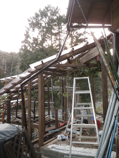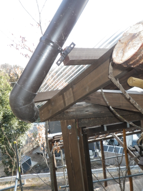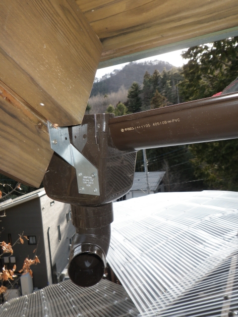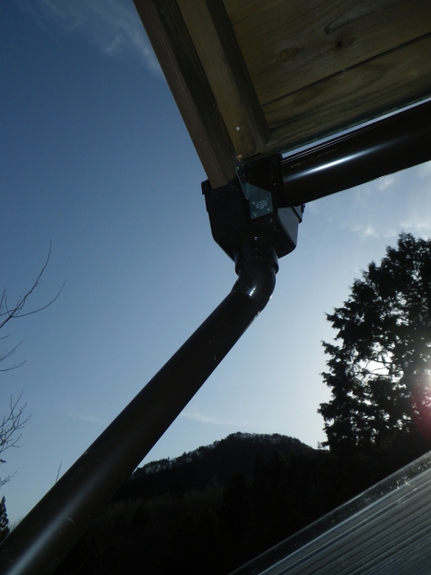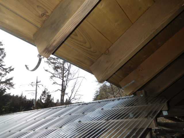 大屋根の新ハウス最上部のポリカ屋根頂部より道路側は、雨樋なしで、そのままポリカ屋根に落とすつもりだったけど、雨降ったら、結構な量の雨水がポリカ屋根に落ちるので、跳ねが結構飛散して廻りを濡らすのと、音も結構煩いので、やっぱり雨樋付ける。
