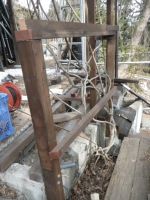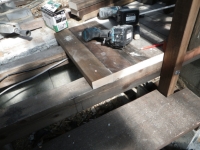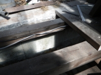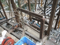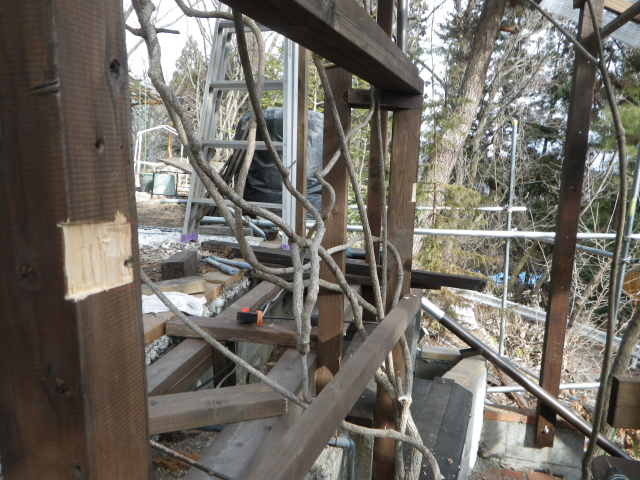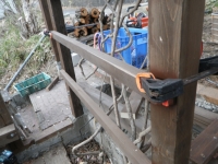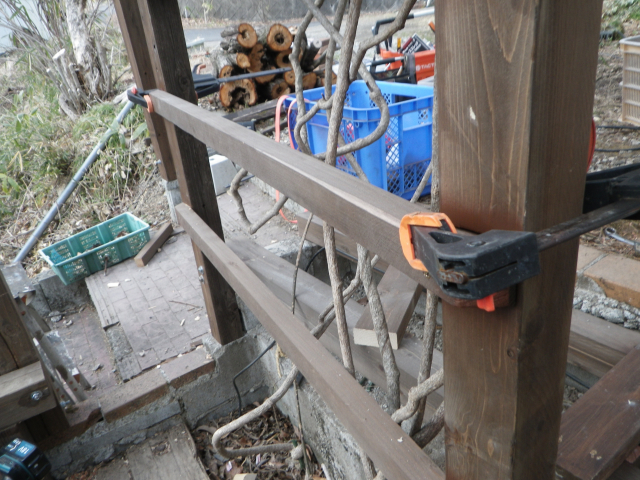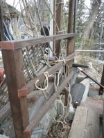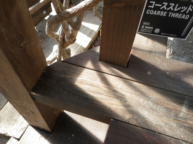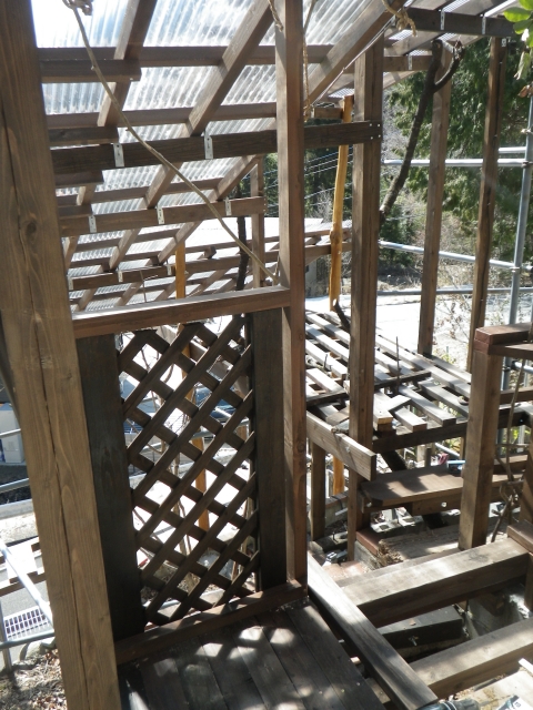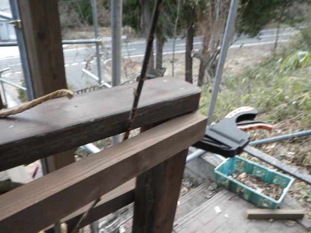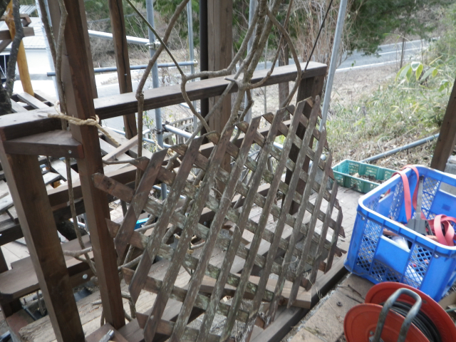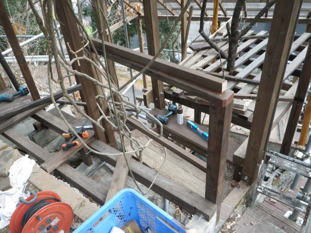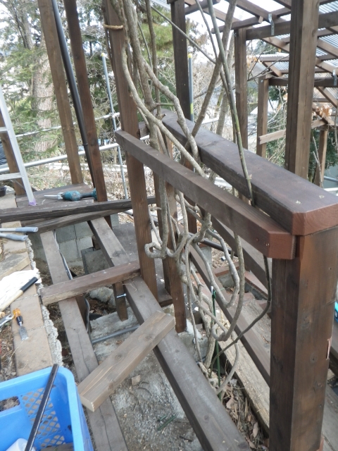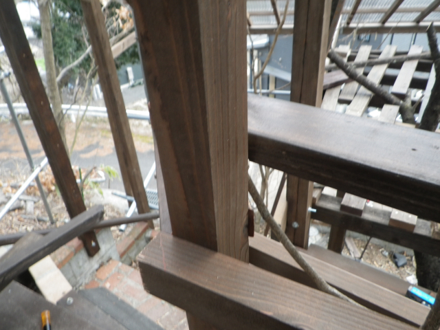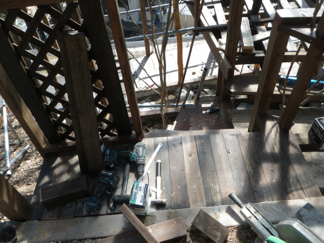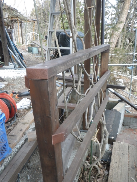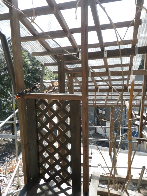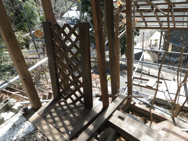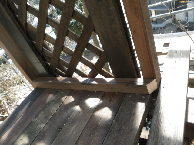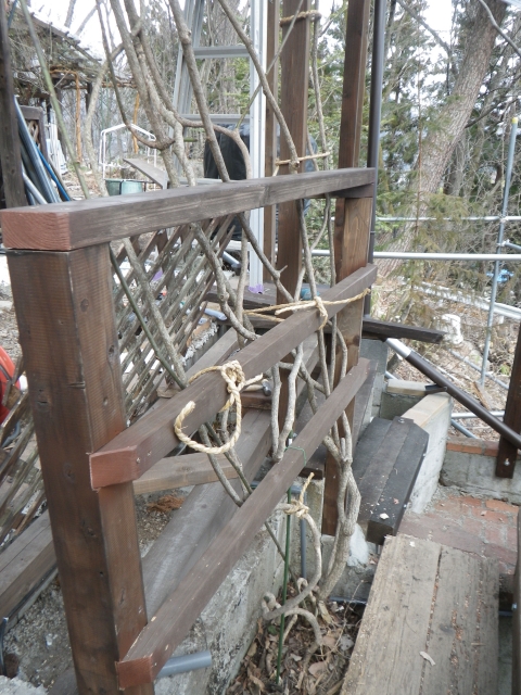 3/9 最上段の新花壇上にデッキ張った部分に、古材のラテスを取付