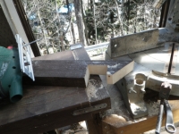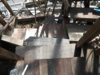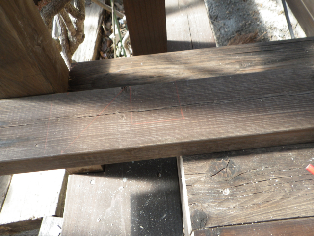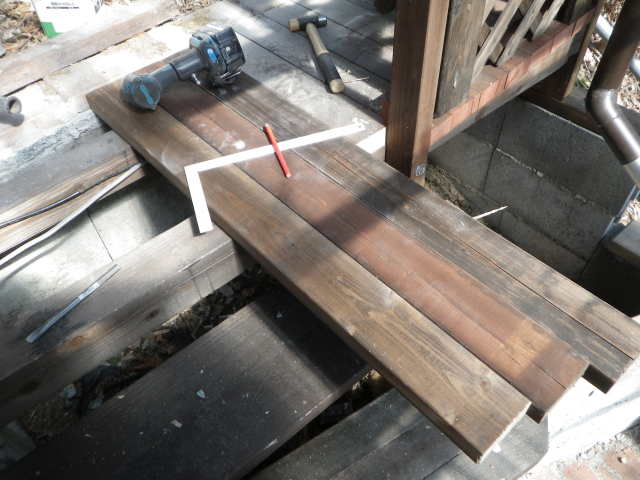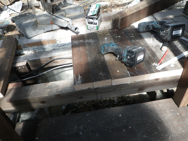 次に、最上段の残りのデッキ面を2x4古材で張っていく