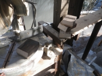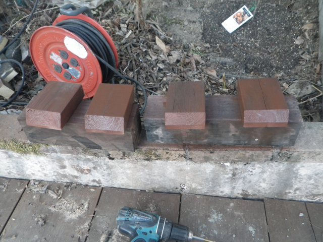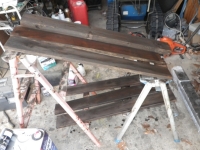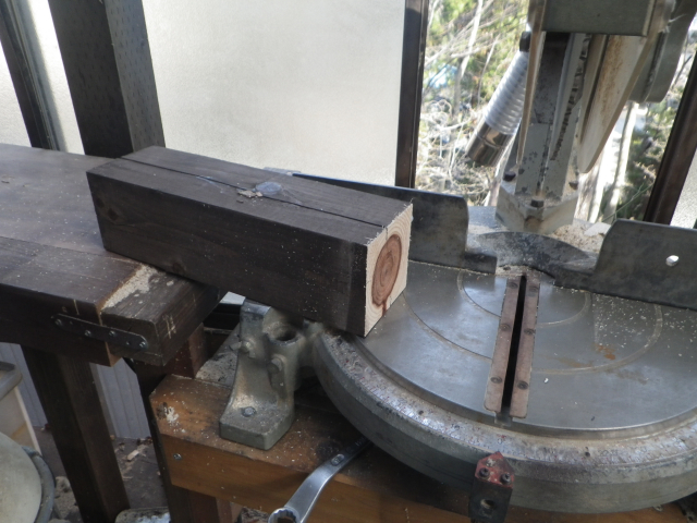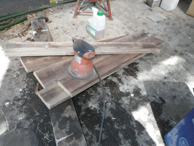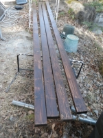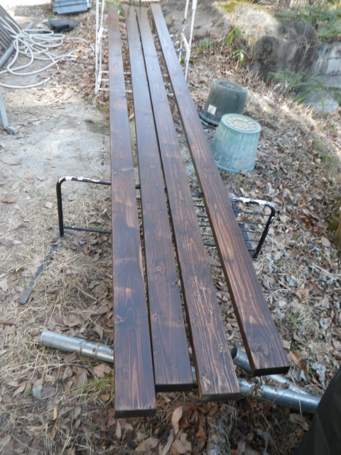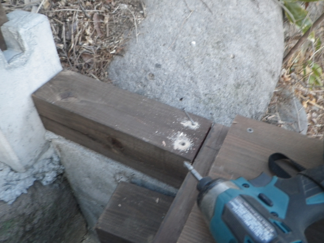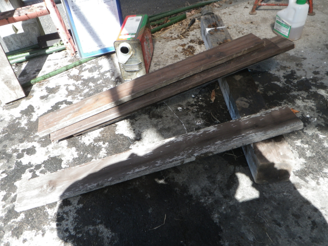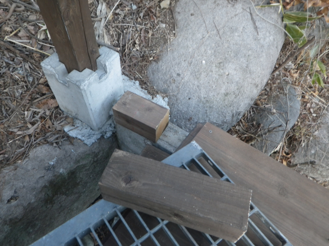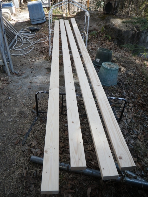 上下の桁(上は手摺、下は桁)を2x4材、格子部分は、1x4材(解体材)