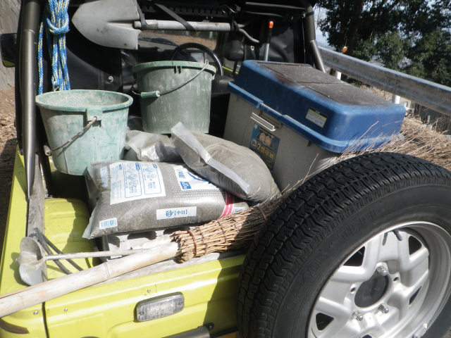 | 3/23 資材買い足し。階段工事は、下から資材揚げた方が楽なので、片づけて資材並べる |