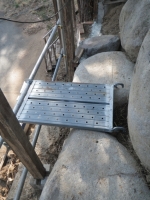 現場近くに作業場所を確保するため、もう1段分柵を撤去して、単管足場置く |