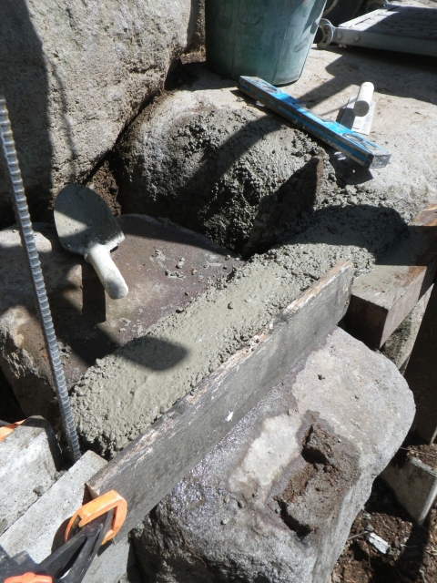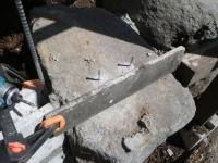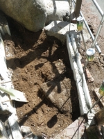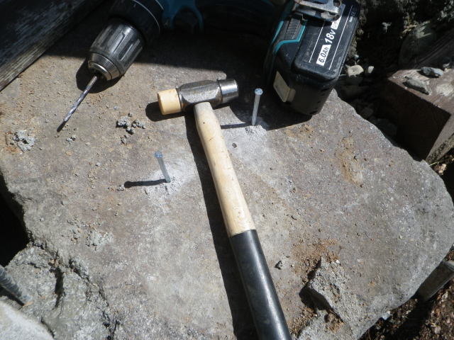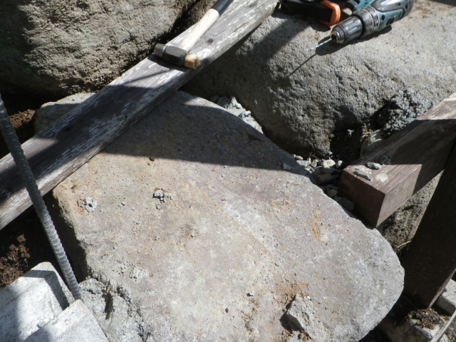 積み石の上に置くブロック用の基礎、コンクリ釘打ってから枠設置