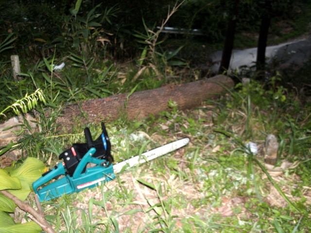 後日、残りも全部玉切りするけど、薪にはしないで、木口ぐらい塗装して、お庭でBBQする時の椅子に使おうかな。)