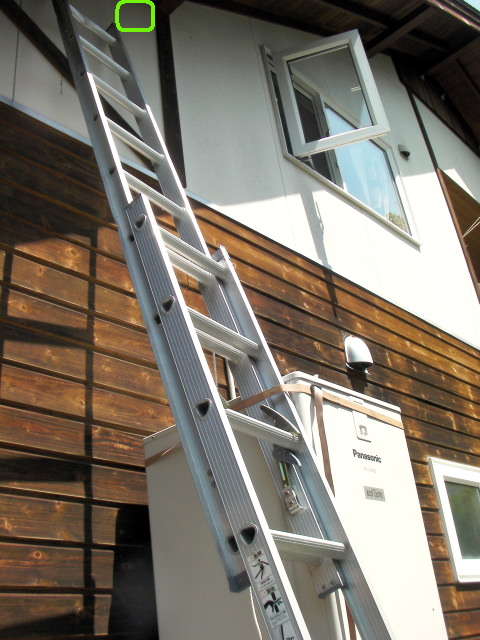 | 【10:21】緑印が取り付け予定場所、一人作業なので、梯子を固定。 |