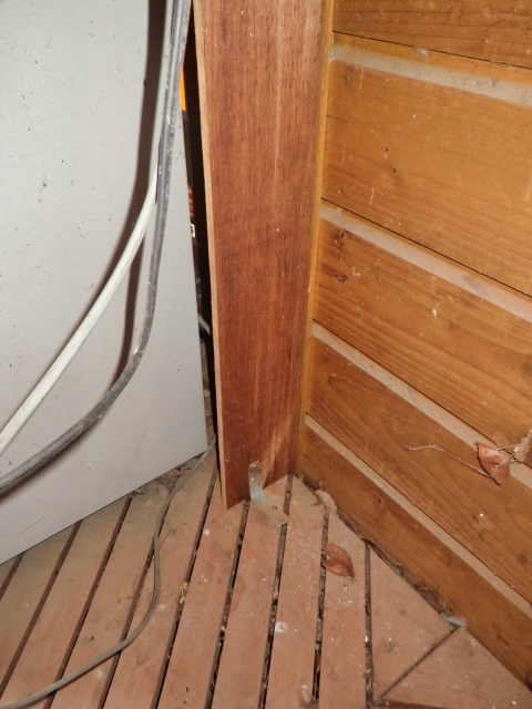 | 冷蔵庫と壁面の隙間は、端材のべニア板で、猫が侵入できない程度に、そこそこ仕切る |