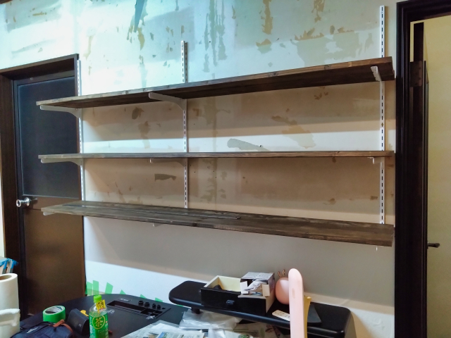 次は書棚、書棚の裏は、後日壁紙を貼る