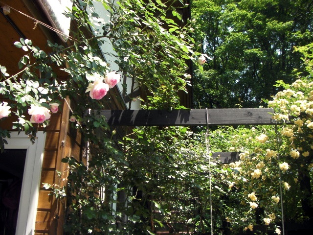 5/24(日) 家の南側のモッコウバラ、ハクロニシキ、バラ。