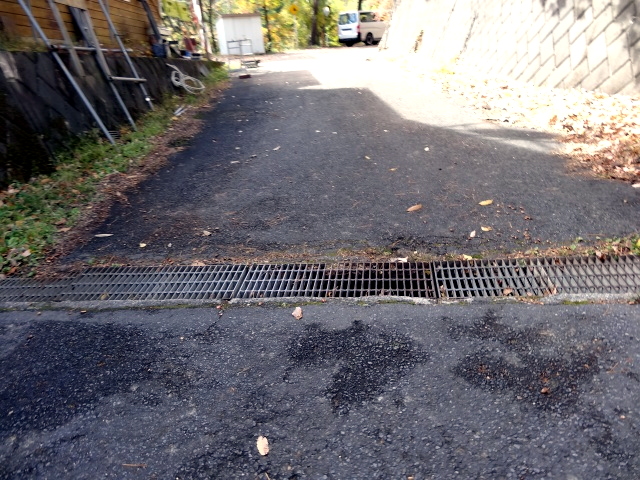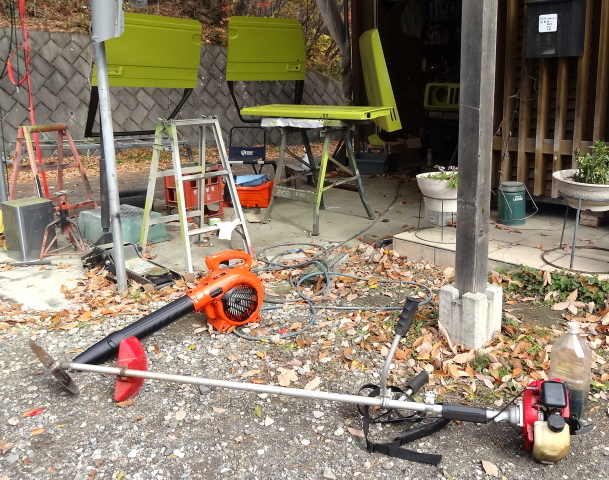 | 【11:12】落ち葉清掃中。家に近い部分は、落ち葉焚き用に倉庫近くに寄せて、外周のカーブより下は、ガードレール外へ |