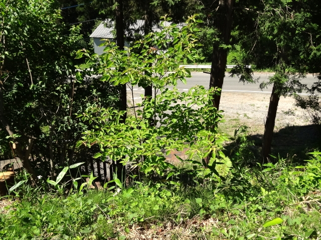 5/20(日) の庭の様子。南法面に生えてきた正体不明の2本。どちらも非常に生育が速い。