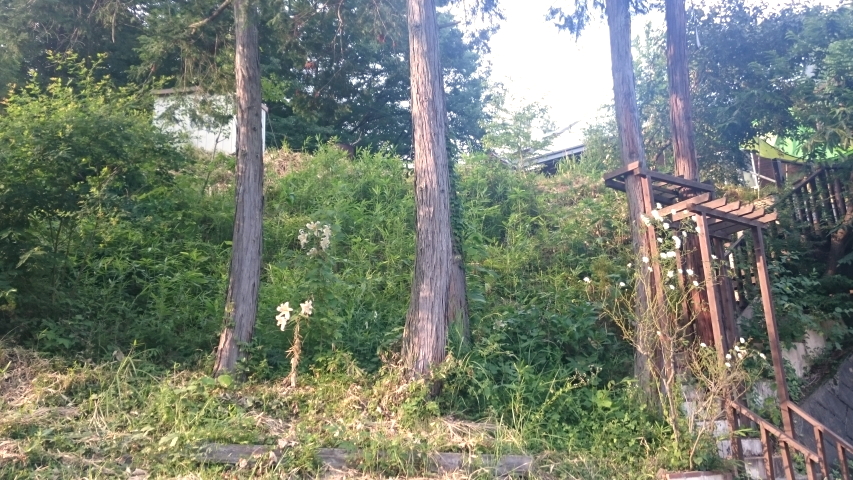 7/21(土) 草刈りの続き、家の外周路の東外側のコサ切り。庭の様子。