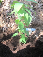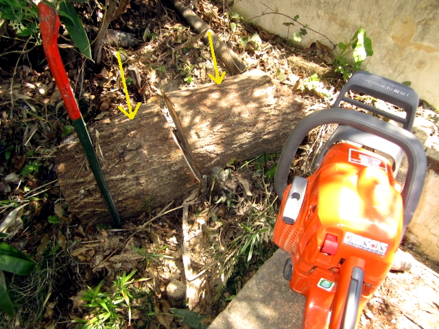 | 先日、半日陰のオオバクロモジ用の場所を決めて、少し整備したけど、上部に去年伐採したコナラの1mほどの丸太が残っていて、何かの拍子に滑り落ちてくると、下にあるものを破壊しそうなので、とりあえず切れそうな場所へ移動させて、半分に切って撤去してから、端材で柵組みをして、苗木を植える。 |