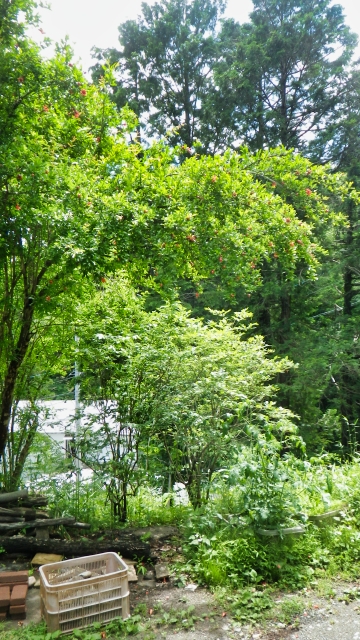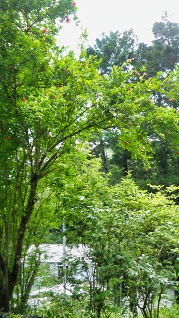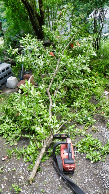 玄関前のザクロが、雨で枝垂れて邪魔なので少しコサ切り |