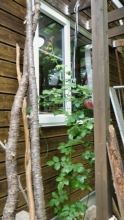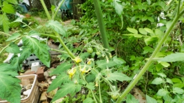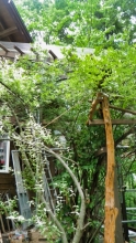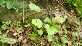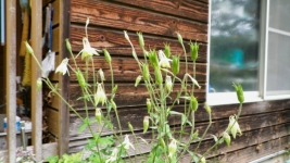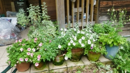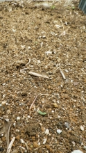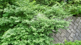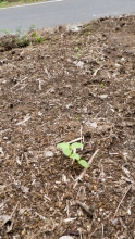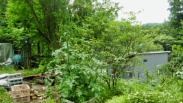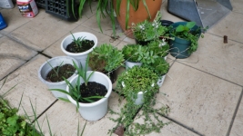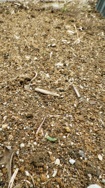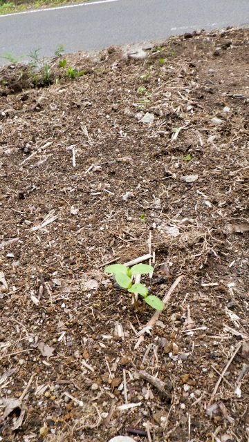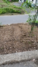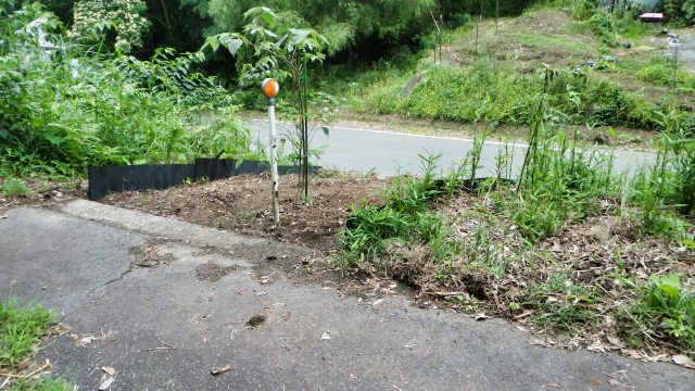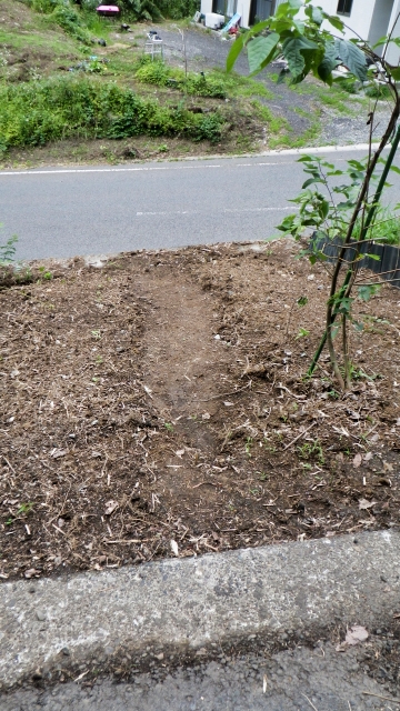 【11:38】外周西側の擁壁土手の花壇の片付け、芽吹いてるのはホウセンカだけ