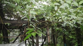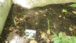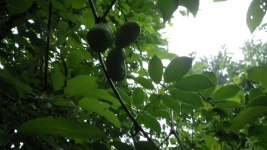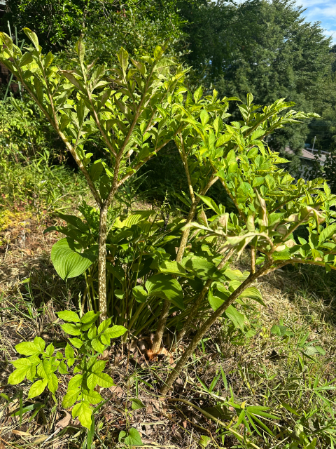 8/7~10:玄関前のコンニャク、旧デッキ跡花壇、桃パーゴラの大実ムベ