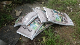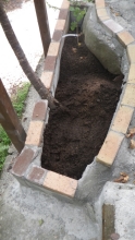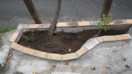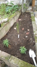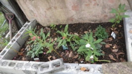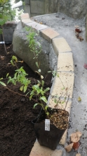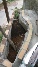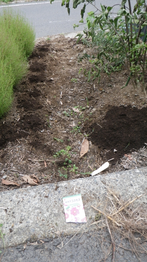 西の擁壁上花壇にもコスモスの種蒔き、土がイマイチだったので、プランター土撒いてから |