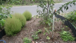 新花壇:左:ユキヤナギ、右:スモークツリー |