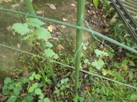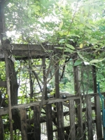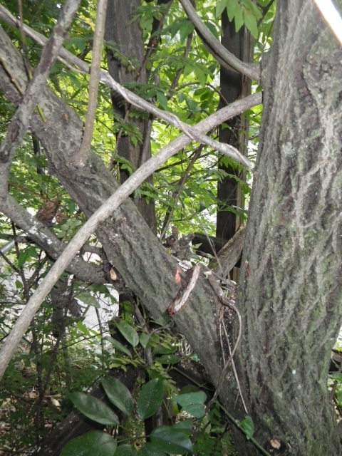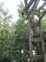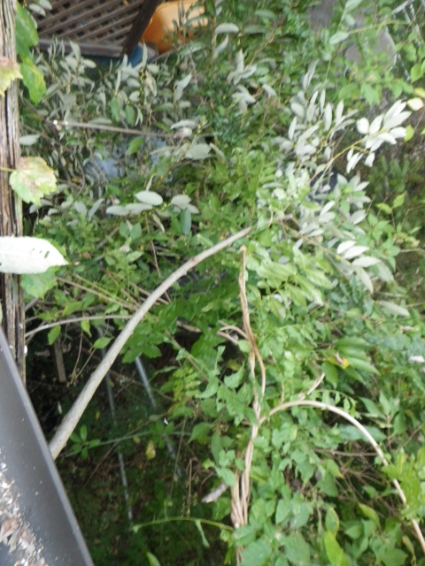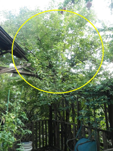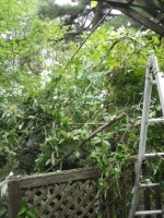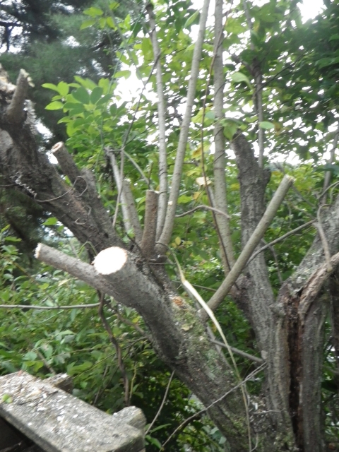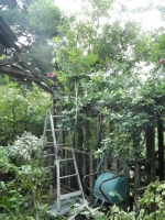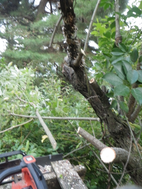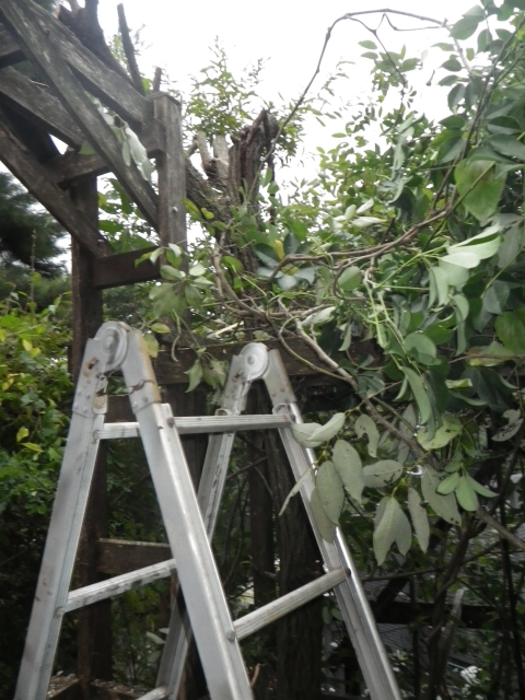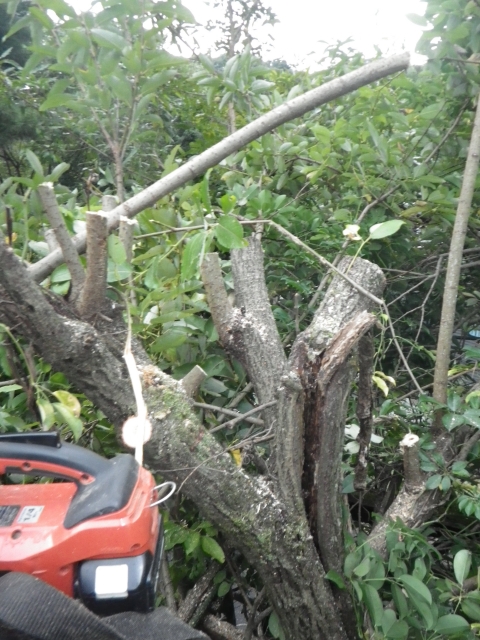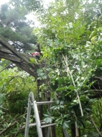 | 上部の伐採完了、根元側倒すと桃パーゴラごと倒れそうなので、足場組んでから切る |