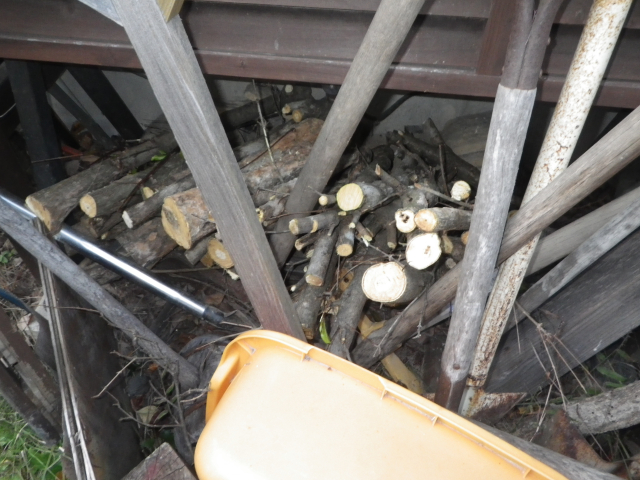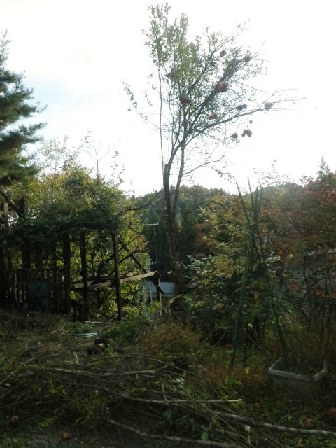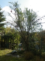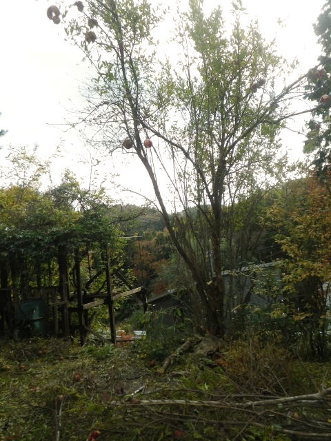 次の朽ちた桃パーゴラ廻りの作り直しで、屋根を張るので、このザクロは邪魔になるので、惜しいが伐採する。 |