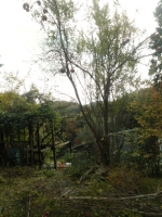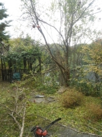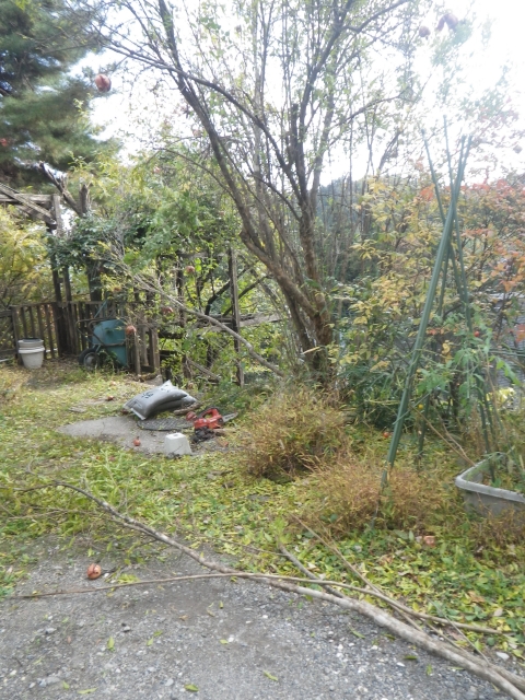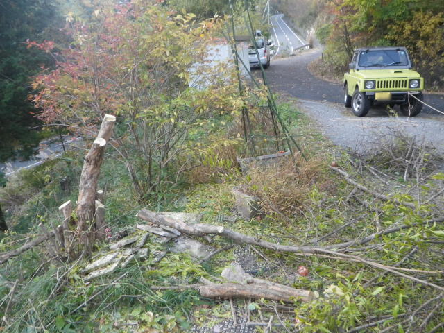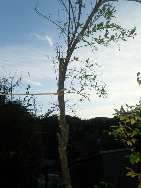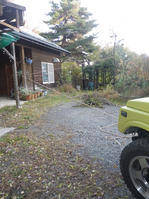 | 最後の枝が、トマトの直上にあって、そのまま切れないので、ジムニーで牽引してから伐倒 |
