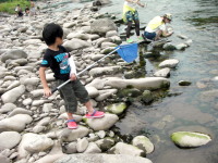 7/6(日) 去年稚魚を20匹ほど捕って、1年飼ったウグイを川に還す。