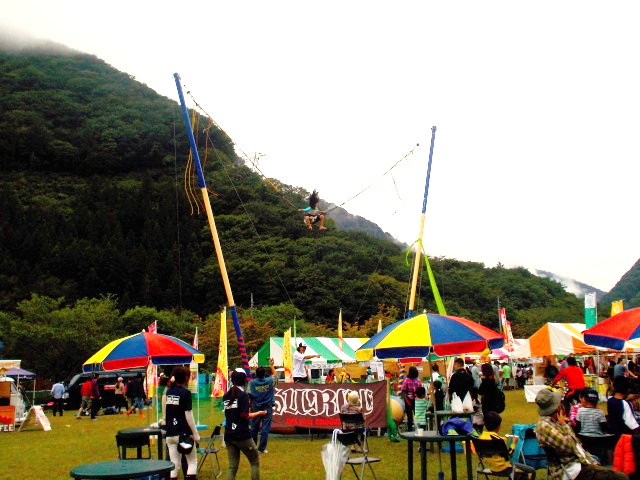 【14:41】スラックラインに挑戦。青矢印は大人用?の高いライン