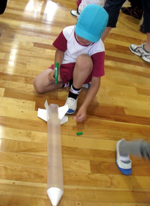 良くお店に置いてある、傘袋を膨らませ、厚紙のキャップと尾翼を付ける。