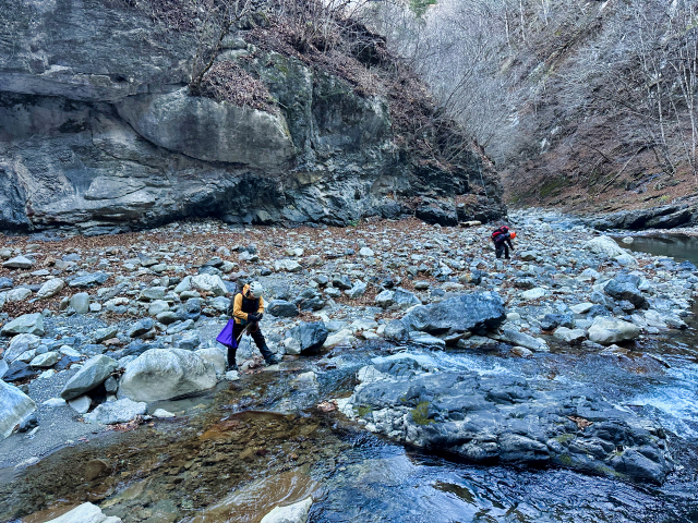 道路から見える場所にあるけど、取り付きまでは、懸垂→渡渉→急斜面登山。
