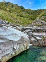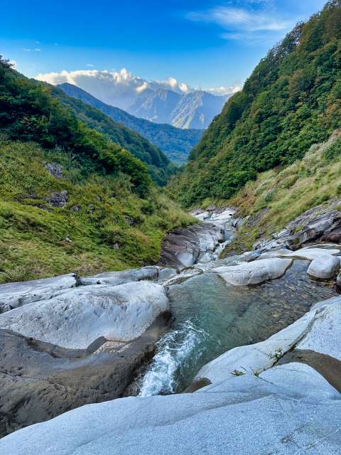 真っ白な花崗岩から、滑らかに流れ落ちる滝や藍染の瓶のような深い藍色の滝壺、そして、芸術作品のような極上のスラブは何度見ても圧巻。