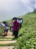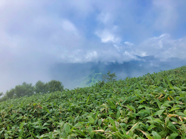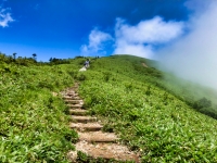 朝イチはけっこうな雨でしたが、山頂への天空階段では青空が......」