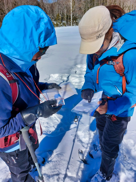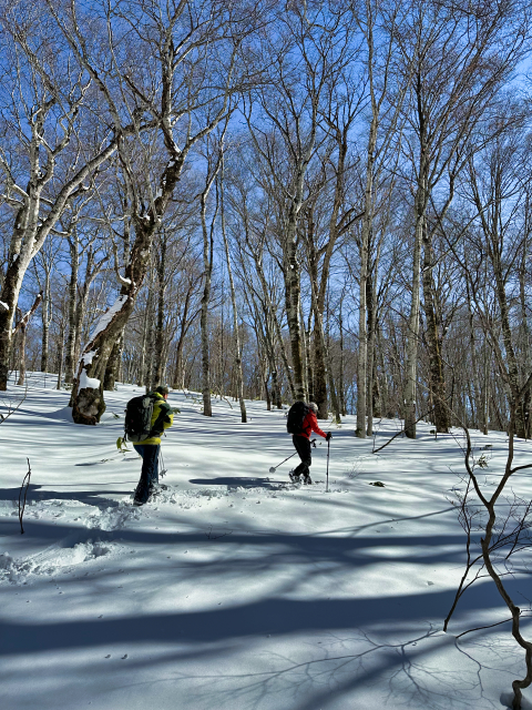 四方八方と広がるブナ林をルートファインディング(地図読み)しながら進み、雪原の玉原湿原へ。