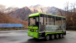 基本的には徒歩だけど、足の悪い方等のために、ロープウェイ山麓駅の裏の方から電気バス2両が有料で運行してます。
