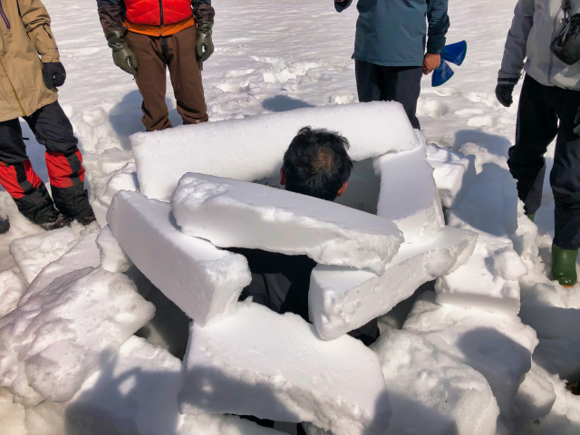 今回、北大OBでイグルー作り第一人者の米山氏による講習会でしたが、やっぱり作ってみなくちゃわからない。