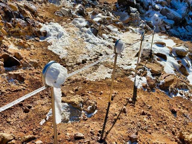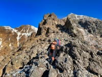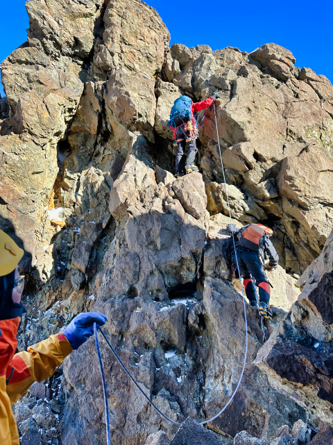 春のような陽気でしたが、雪のない東南稜は浮岩だらけ。