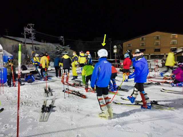 +大松ゲレンデのホワイトピーク下部で、8:30〜10:30(SL),12:30〜14:30(GS)の2コマの練習。
